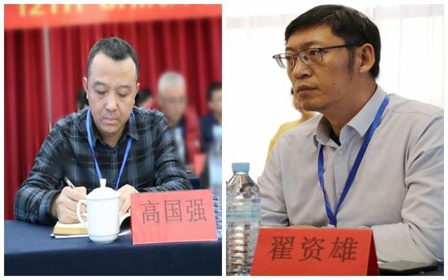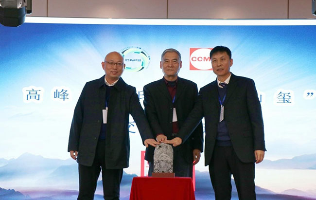 中國(guó)工程機(jī)械工業(yè)協(xié)會(huì)筑養(yǎng)路機(jī)械分會(huì)會(huì)長(zhǎng)焦生杰(中)的見(jiàn)證下,河南亞龍智能裝備有限公司總經(jīng)理張大禹向吉林省公路機(jī)械有限公司總經(jīng)理邵永祥移交峰會(huì)印信“泰山璽”。
